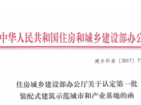 2017年11月9日,住房城鄉(xiāng)建設(shè)部辦公廳印發(fā)《關(guān)于認(rèn)定第一批裝配式建筑示范城市和產(chǎn)業(yè)基地的函》...