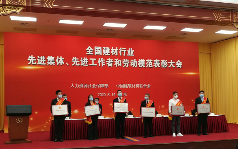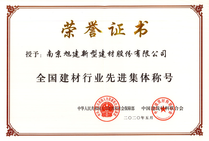 2020年8月14日人力資源社會(huì)保障部、中國建筑材料聯(lián)合會(huì)在北京友誼賓館召開了關(guān)于“全國建材行業(yè)先進(jìn)集體、先進(jìn)工作者和勞動(dòng)模范表彰大會(huì)”,會(huì)上對來自全國的98個(gè)單位、95名個(gè)人進(jìn)行了表彰,南京旭建新型建材股份有限公司榮獲“全國建材行業(yè)先進(jìn)集體”稱號(hào)。